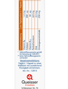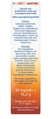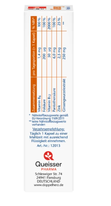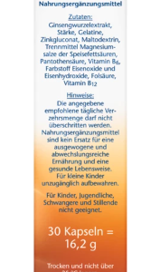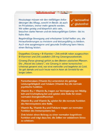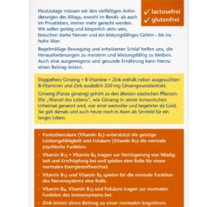 Les capsules Doppelherz Ginseng 250 contiennent des vitamines B6 et B12, qui contribuent à la réduction de la fatigue et de l’épuisement et jouent un rôle dans le métabolisme énergétique normal. L’acide pantothénique (vitamine B5) soutient les performances mentales, l’acide folique (vitamine B9) soutient une fonction psychologique normale.