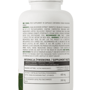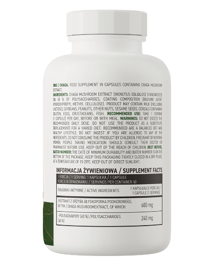 Le chaga (Inonotus obliquus) est un champignon parasite de la famille des Hymenochaetaceae. Il pousse principalement sur les bouleaux, mais on le trouve parfois aussi sur d’autres espèces d’arbres à feuilles caduques. Ce champignon se développe surtout dans le nord de la Chine et en Sibérie. Riche en mélanine, le chaga est également utilisé comme ingrédient dans les cosmétiques naturels. L’extrait de champignon chaga utilisé dans la préparation OstroVit est standardisé à 40 % de polysaccharides, ce qui améliore la qualité du complément alimentaire et garantit un apport optimal en composés bénéfiques à chaque portion.