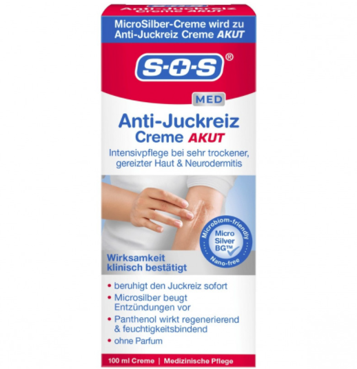 SOS Skin Cream Derma Care Crème Anti-Démangeaisons Aiguës, Crème MicroSilver, non parfumée, tube, 100 ml